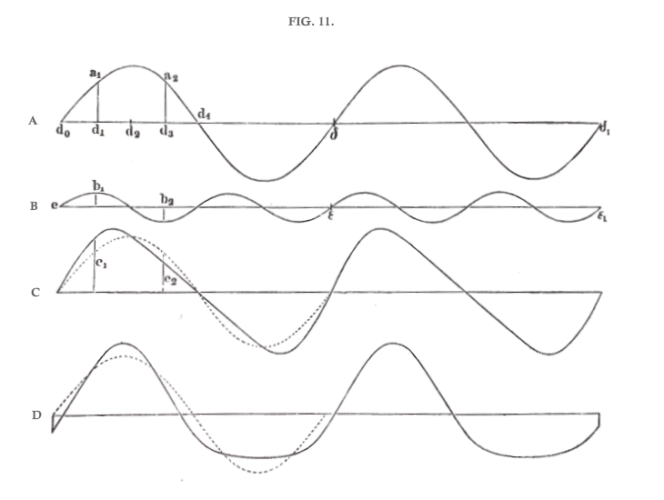 In order to give a slight conception of the multiplicity of forms producible by comparatively simple compositions, I may remark that the compound curve would receive another form if the curves B, fig. 11, were displaced a little with respect to the curve A before the addition were commenced. Let B be displaced by being slid to the right until the point e falls under d1 in A, and the composition will then give the curve D with narrow crests and broad troughs, both sides of the crest being, however, equally steep; whereas in the curve C one side is steeper than the other. If we displace the curve B still more by sliding it to the right till e falls under d2, the compound curve would resemble the reflection of C in a mirror: that is, it would have the same form as C reversed as to right and left; the steeper inclination which in C lie to the left would now lie to the right. Again, if we displace B till e falls under d3 we obtain a curve similar to D, fig. 11, but reversed as to up and down, as may be seen by holding the book upside-down, the crests being broad and the troughs narrow.