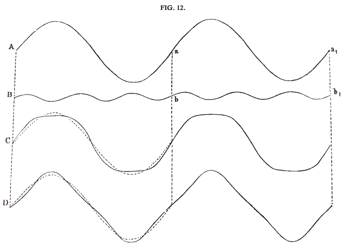 All these curves with their various transitional forms are periodic curves. Other composite periodic curves are shewn at C, D, fig. 12 above, where they are compounded of the two curves A and B, having their periods in the ratio of 1 to 3. The dotted curves are as before copies of the first complete vibration or period of the curve A, in order that the reader may see at a glance that the compound curve is always as much higher or lower than A, as B is higher or lower than the horizontal line. In C, the curves A and B are added as they stand, but for D the curve B has been first slid half a wave's length to the right, and then the addition has been effected. Both forms differ from each other and from all preceding ones. C has broad crests and broad troughs, D narrow crests and narrow troughs.