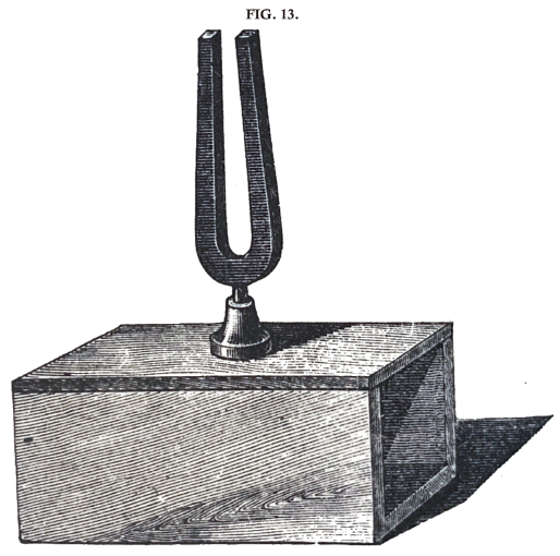 Tuning-forks are the most difficult bodies to set in sympathetic vibration. To effect this they may be fastened on sounding boxes which have been exactly tuned to their tone, as shewn in fig. 13. If we have two such forks of exactly the same pitch, and excite one by a violin bow, the other will begin to vibrate in sympathy, even if placed at the further end of the same room, and it will continue to sound, after the first has been damped. The astonishing nature of such a case of sympathetic vibration will appear, if we merely compare the heavy and powerful mass of steel set in motion, with the light yielding mass of air which produces the effect by such small motive powers that they could not stir the lightest spring which was not in tune with the fork. With such forks the time required to set them in full swing by sympathetic action, is also of sensible duration, and the lightest disagreement in pitch is sufficient to produce a sensible diminution in the sympathetic effect. By sticking a piece of wax to one prong of the second fork, sufficient to make it vibrate once in a second less than the first — a difference of pitch scarcely sensible to the finest ear — the sympathetic vibration will be wholly destroyed.