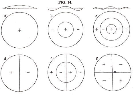 In many cases the vibrations and their mode of distribution over the vibrating bodies can be rendered visible by strewing a little fine sand over the latter. Take, for example, a membrane (as a bladder or piece of thin india-rubber) stretched over a circular ring. In fig. 14 are shewn the various forms which a membrane can assume when it vibrates. The diameters and circles on the surface of the membrane mark those points which remain at rest during the vibration, and are known as nodal lines. By these the surface is divided into a number of compartments which bend alternately up and down, in such a way that while those marked ( + ) rise, those marked ( - ) fall. Over the figures a, b, c, are shewn the forms of a section of the membrane during vibration. Only those forms of motion are drawn which correspond with the deepest and most easily producible tones of the membrane. The number of circles and diameters can be increased at pleasure by taking a sufficiently thin membrane, and stretching it with sufficient regularity, and in this case the tones would continually sharpen in pitch. By strewing sand on the membrane the figures are easily rendered visible, for as soon as it begins to vibrate the particles of sand collect on the nodal lines.