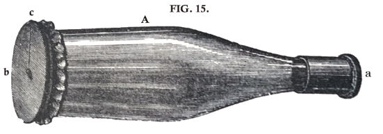 Strew a very thin membrane of this kind with sand, and sound its prime tone strongly in its neighbourhood; the sand will be driven by the vibrations towards the edge, where it collects. On producing another of the tones of the membrane, the sand collects in the corresponding nodal lines, and we are thus easily able to determine to which of its tones the membrane has responded. A singer who knows how to hit the tones of the membrane correctly, can thus easily make the sand arrange itself at pleasure in one order or the other, by singing the corresponding tones powerfully at a distance. But in general the simpler figures of the deeper tones are more easily generated than the complicated figures of the upper tones. It is easiest of all to set the membrane in general motion by sounding its prime tone, and hence such membranes have been much used in acoustics to prove the existence of some determinate tone in some determinate spot of the surrounding air. It is most suitable for this purpose to connect the membrane with an inclosed mass of air. A, fig. 15, is a glass bottle, having a open mouth a, and in place of its bottom b, a stretched membrane, consisting of wet pig's bladder, allowed to dry after it has been stretched and fastened. At c is attached a single fibre of a silk cocoon, bearing a drop of sealing-wax, and hanging down like a pendulum against the membrane. As soon as the membrane vibrates, the little pendulum is violently agitated. Such a pendulum is very convenient as long as we have no reason to apprehend any confusion of the prime tone of the membrane with any other of its proper tones. There is no scattering of sand, and the apparatus is therefore always in order. But to decide with certainty what tones are really agitating the membrane, we must after all place the bottle with its mouth downwards and strew sand on the membrane. However, when the bottle is of the right size, and the membrane uniformly stretched and fastened, it is only the prime tone of the membrane (slightly altered by that of the sympathetically vibrating mass of air in the bottle) which is easily excited. This prime tone can be made deeper by increasing the size of the membrane, or the volume of the bottle, or by diminishing the tension of the membrane or size of the orifice of the bottle.