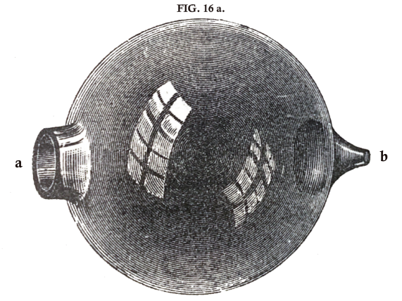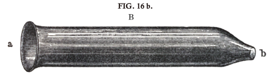 Stretched membranes of this kind are very convenient for these and similar experiments on the partials of compound tones. They have the great advantage of being independent of the ear, but they are not very sensitive for the fainter simple tones. Their sensitiveness is far inferior to that of the res'onātors which I have introduced. These are hollow spheres of glass or metal, or tubes, with two openings as shewn in figs. 16 a and 16 b. One opening (a) has sharp edges, the other (b) is funnel-shaped, and adapted for insertion into the ear. This smaller end I usually coat with melted sealing wax, and when the wax has cooled down enough not to hurt the finger on being touched, but is still soft, I press the opening into the entrance of my ear. The sealing wax thus moulds itself to the shape of the inner surface of this opening, and when I subsequently use the resonator, it fits easily and is air-tight. Such an instrument is very like the resonance bottle already described, fig. 15 (p. 42), for which the observer's own tympanic membrane has been made to replace the former artificial membrane.