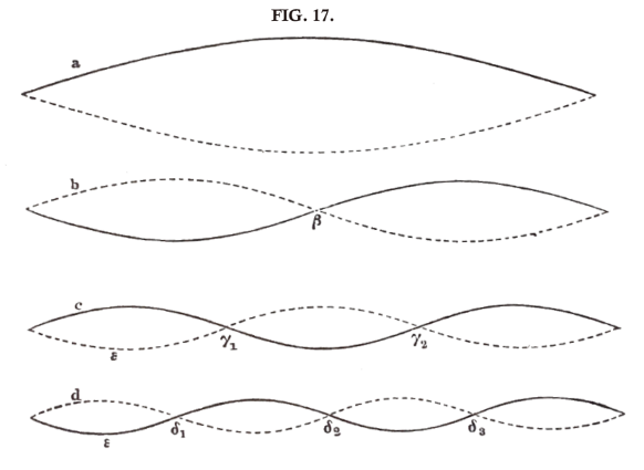 But the string may also during its motion assume the forms fig. 17, b, c, d. In this case the form of the string is that of two, three, or four half waves of a simple wave-curve. In the vibrational form b the string produces only the upper Octave of its prime tone, in the form c the Twelfth, and in the form d the second Octave. The dotted lines shew the position of the string at the end of half its periodic time. In b the point β remains at rest, in c two points γ1 and γ2 remain at rest, in d three points δ1, δ2, δ3. These points are called nodes. In a swinging spiral wire the nodes are readily seen, and for a resonant string they are shewn by little paper riders, which are jerked off from the vibrating parts and remain sitting on the nodes. When, then, the string is divided by a node into two swinging sections, it produces a simple tone having a pitch number double that of the prime tone. For three sections the pitch number is tripled, for four sections quadrupled, and so on.