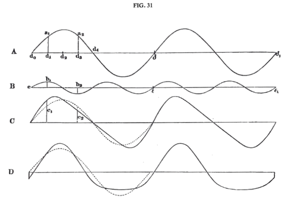 Up to this point we have not endeavoured to analyse given musical tones further than to determine the differences in the number and loudness of their partial tones. Before we can determine the function of the ear in apprehending qualities of tone, we must inquire whether a determinate relative strength of the upper partials suffices to give us the impression of a determinate musical quality of tone or whether there are not also other perceptible differences in quality which are independent of such a relation. Since we deal only with musical tones, that is, with such as are produced by exactly periodic motions of the air, and exclude all irregular motions of the air which appear as noises, we can give this question a more definite form. If we suppose the motion of the air corresponding to the given musical tone to be resolved into a sum of pendular vibrations of air, such individual pendular vibrations will not only differ from each other in force or amplitude for different forms of the compound motion, but also in their relative position, or, according to physical terminology, in their difference of phase. For example, if we superimpose the two pendular vibrational curves A and B, fig. 31 (p. 120), first with the point e of b on the point d0 of a, and next with the point e of b on the point d1 of a, we obtain the two entirely distinct vibrational curves C and D. By further displacement of the initial point e so as to place it on d2 or d3 we obtain other forms, which are the inversions of the forms C and D, as has been already shewn (supra, p. 32). If, then, musical quality of tone depends solely on the relative force of the partial tones, all the various motions C, D, &c., must make the same impression on the ear. But if the relative position of the two waves, that is the difference of phase, produces any effect, they must make different impressions on the ear.