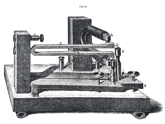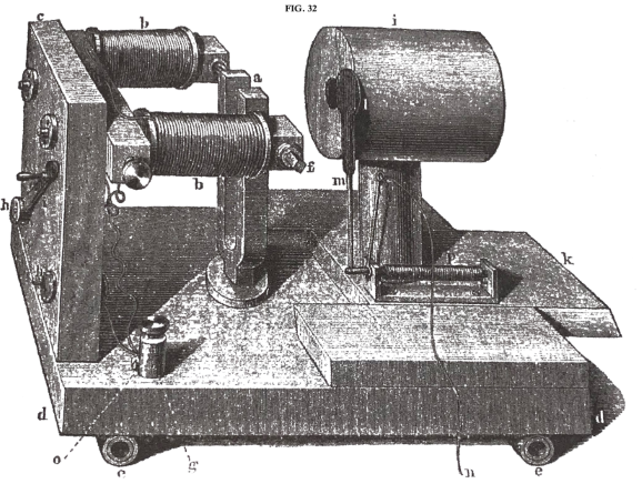 Now to determine this point it was necessary to compound various musical tones out of simple tones artificially, and to see whether an alteration of quality ensued when force was constant but phase varied. Simple tones of great purity, which can have both their force and phase exactly regulated, are best obtained from tuning-forks having the lowest proper tone reinforced, as has been already described (p. 54), by a resonance chamber, and communicated to the air. To set the tuning-forks in very uniform motion, they were placed between the limbs of a little electro-magnet, as shewn in fig. 32, opposite. Each tuning-fork was screwed into a separate board d d, which rested upon pieces of india-rubber tubing e e that were cemented below it, to prevent the vibrations of the fork from being directly communicated to the table and hence becoming audible. The limbs b b of the electro-magnet are surrounded with wire, and its pole f is directed to the fork. There are two clamp screws g on the board d d which are in conductive connection with the coils of the electro-magnet, and serve to introduce other wires which conduct the electric current. To set the forks in strong vibration the strength of these streams must alternate periodically. These are generated by a separate apparatus to be presently described (fig. 33, p. 122).