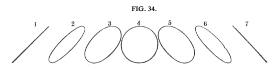 When the observed fork is in unison with the interrupting fork, the curve becomes an oblique straight line (fig. 34, 1), if both forks pass through their position of rest at the same moment. As the phase alters, the straight line passes through a long oblique ellipse (2, 3), till on the difference of phase becoming a quarter of a period, it develops into a circle (4); and then as the difference of phase increases, it passes through oblique ellipses (5, 6) in another direction, till it reaches another straight line (7), on the difference becoming half a period.