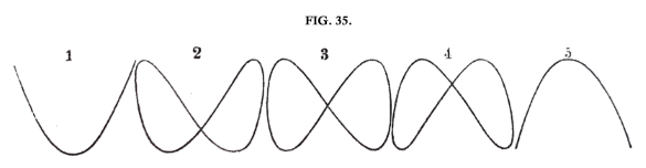 If the second fork is the upper Octave of the interrupting fork, the curves 1, 2, 3, 4, 5, in fig. 35, shew the series of forms. Here 3 answers to the case when both forks pass through their position of rest at the same time; 2 and 4 differ from that position by \(\tfrac{1}{12}\), and 1 and 5 by \(\tfrac14\) of a wave of the higher fork.