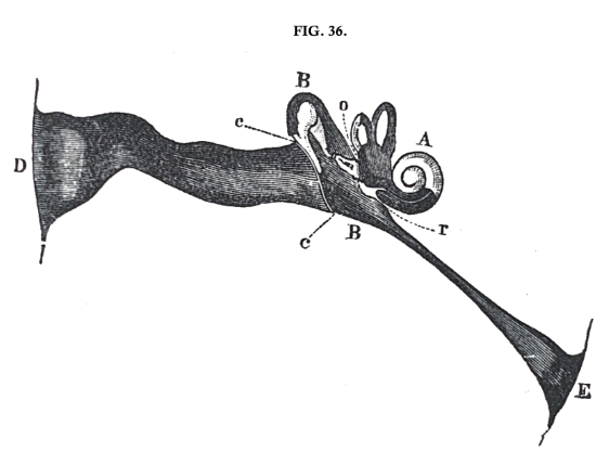 The construction of the ear may be briefly described as follows : — The fine ends of the fibres of the auditory nerves are expanded on a delicate membrane in a cavity filled with fluid. Owing to its involved form this cavity is known as the labyrinth of the ear. To conduct the vibrations of the air with sufficient force into the fluid of the labyrinth is the office of a second portion of the ear, the tympănum or drum and the parts within it. Fig. 36 above is a diagrammatic section, of the size of life, shewing the cavities belonging to the auditory apparatus. A is the labyrinth, B B the cavity of the tympănum or drum, D the funnel-shaped entrance into the meātus or external auditory passage, narrowest in the middle and expanding slightly towards its upper extremity. This meātus, in the ear or passage, is a tube formed partly of cartilage or gristle and partly of bone, and it is separated from the tympănum or drum, by a thin circular membrane, the membrāna tympănī or drumskin[8] c c, which is rather laxly stretched in a bony ring. The drum (tym'pănum) B lies between the outer passage (meātus) and the labyrinth. The drum is separated from the labyrinth by bony walls, pierced with two holes, closed by membranes. These are the so-called windows (fenes'trae) of the labyrinth. The upper one o, called the oval window (fenes'tra ōvālis), is connected with one of the ossicles or little bones of the ear called the stirrup. The lower or round window r (fenes'tra rotun'da) has no connection with these ossicles.