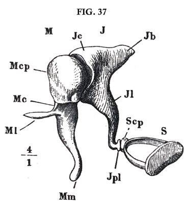 In two places, this air in the drum is likewise separated from the fluid of the labyrinth merely by a thin stretched membrane, which closes the two windows of the labyrinth, already mentioned, namely, the oval window (o, fig. 36, p. 129) and the round window (r). Both of these membranes are in contact on their outer side with the air of the drum, and on their inner side with the water of the labyrinth. The membrane of the round window is free, but that of the oval window is connected with the drumskin of the ear by a series of three little bones or auditory ossicles, jointed together. Fig. 37 shews the three ossicles in their natural connection, enlarged four diameters. They are the hammer (mal'leus) M, the anvil (in'cūs) J, and the stirrup (sta'pes[10]) S. The hammer is attached to the drumskin, and the stirrup to the membrane of the oval window.