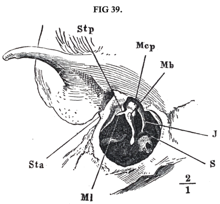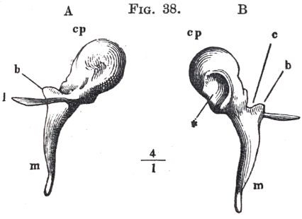 The hammer shewn separately in fig. 38, has a thick, rounded upper extremity, the head cp, and a thinner lower extremity, the handle m. Between these two is a contraction c, the neck. At the back of the head is the surface of the joint, by means of which it fits on to the anvil. Below the neck, where the handle begins, project two processes, the long l, also called processus Foliānus and pr. grăcĭlis, and the short b, also called pr. bre'vis. The long process has the proportionate length shewn in the figure, in children only; in adults it appears to be absorbed down to a little stump. It is directed forwards, and is covered by which fasten the hammer in front. The short process b, on the other hand, is directed towards the drumskin, and presses its upper part a little forwards. From the point of this process b to the point of the handle m the hammer is attached to the upper portion of the drumskin, in such a manner that the point of the handle draws the drumskin considerably towards the inner part of the ear.