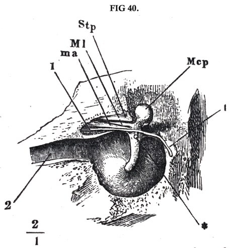 Fig. 39 above shews the hammer in its natural position as seen from without, after the drumskin has been removed, and fig. 40 shews the hammer lying against the drumskin as seen from within. The hammer is fastened along the upper margin of the drumskin by a fold of mucous membrane, within which run a series of rather stiff bundles of tendinous fibres. These straps arise in a line which passes from the processus Folianus (fig. 38, l), above the contraction of the neck, towards the lower end of the surface of the joint for the anvil, and in elderly people is developed into a prominent ridge of bone. The tendinous bands or ligaments are strongest and stiffest at the front and back end of this line of insertion. The front portion of the ligament, lig. mallei anterius (fig. 40, ma), surrounds the processus Folianus, and is attached partly to a bony spine (figs. 39 and 40, Stp) of the osseous ring of the drum, which projects close to the neck of the hammer, and partly to its under edge, and partly falls into a bony fissure which leads towards the articulation of the jaw. The back portion of the same ligament, on the other hand, is attached to a sharp-edged bony ridge projecting inwards from the drumskin, and parallel to it, a little above the opening, through which a traversing nerve, the chorda tympănī (fig. 40, l, l, p. 131), enters the bone. This second bundle of fibres may be called the lig. mallĕī posterĭus. In fig. 39 (p. 131) the origin of this ligament is seen as a little projection of the ring to which the drumskin is attached. This projection bounds towards the right the upper edge of the opening for the drumskin, which begins to the left of Stp, exactly at the place where the long process of the anvil makes its appearance in the figure. These two ligaments, front and back, taken together form a moderately tense sinewy chord, round which the hammer can turn as on an axis. Hence even when the two other ossicles have been carefully removed, without loosening these two ligaments, the hammer will remain in its natural position, although not so stiffly as before.