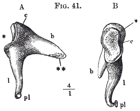 The anvil, which is shewn separately in fig. 41, resembles a double tooth with two fangs; the surface of its joint with the hammer (at *, fig. 41), replacing the masticating surface. Of the two roots of the tooth which are rather widely separated, the upper, directed backwards, is called the short process b; the other, thinner and directed downwards, the long process of the anvil l. At the tip of the latter is the knob which articulates with the stirrup. The tip of the short is of a short ligament and an imperfectly developed joint at its under surface, is connected with the back wall of the cavity of the drum, at the spot where this passes backwards into the air cavities of the mastoid process behind the ear. The joint between anvil and hammer is a curved depression of a rather irregular form, like a saddle. In its action it may be compared with the joints of the well-known Breguet watchkeys, which have rows of interlocking teeth, offering scarcely any resistance to revolution in one direction, but allowing no revolution whatever in the other. Interlocking teeth of this kind are developed upon the under side of the joint between hammer and anvil. The tooth on the hammer projects towards the drumskin, that of the anvil lies inwards; and, conversely, towards the upper end of the hollow of the joint, the anvil projects outwards, and the hammer inwards. The consequence of this arrangement is that when the hammer is drawn inwards by the handle, it bites the anvil firmly and carries it with it. Conversely, when the drumskin, with the hammer, is driven outwards, the anvil is not obliged to follow it. The interlocking teeth of the surfaces of the joint then separate, and the surfaces glide over each other with very little friction. This arrangement has the very great advantage of preventing any possibility of the stirrup's being torn away from the oval window, when the air in the auditory passage is considerably rarefied. There is also no danger from driving in the hammer, as might happen when the air in the auditory passage was condensed, because it is powerfully opposed by the tension of the drumskin, which is drawn in like a funnel.
