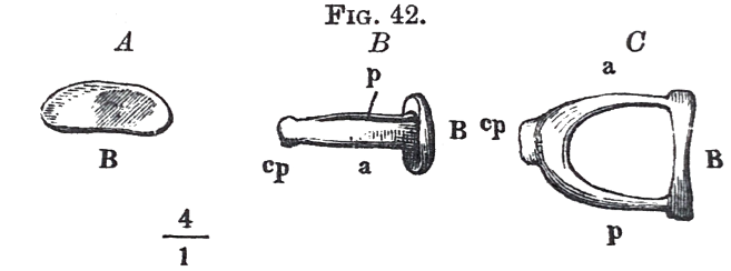 The third ossicle, the stirrup, shewn separately in fig. 42, has really a most striking resemblance to the implement after which it has been named. The foot B is fastened into the membrane of the oval window, and fills it all up, with the exception of a narrow margin. The head cp, has an articulating hole for the tip of the long process of the anvil (processus lenticulāris, or os orbiculāre). The joint is surrounded by a lax membrane. When the drumskin is normally drawn inwards, the anvil presses on the stirrup, so that no tighter ligamentous fastening of the joint is necessary. Every increase in the push on the hammer arising from the drumskin also occasions an increase in the push of the stirrup against the oval window; but in this action the upper and somewhat looser margin of its foot is more displaced than the under, so that the head rises slightly; this motion again causes a slight elevation of the tip of the long process in the anvil, in the direction conditioned by its position, inwards and underneath the ligamentous axis of the hammer.