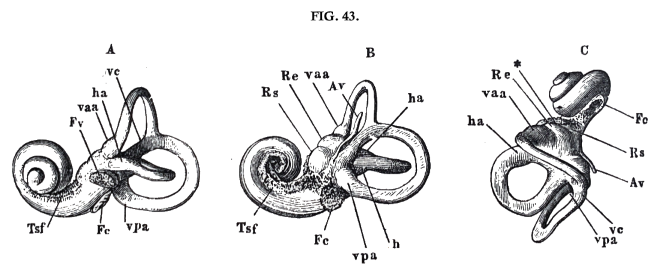 We now proceed to describe the innermost division of the organ of hearing, called the labyrinth. Fig. 43 (p. 136) represents a cast of its cavity, as seen from different positions. Its middle portion, containing the oval window Fv (fenestra vestĭbŭlī) that receives the foot of the stirrup, is called the vestibule of the labyrinth. From the vestibule proceeds forwards and underwards, a spiral canal, the snail-shell or cochlĕa, at the entrance to which lies the round window Fc (fenestra cochlĕae), which is turned towards the cavity of the drum. Upwards and backwards, on the other hand, proceed three semicircular canals from the vestibule, the horizontal, front vertical and back vertical semicircular canals, each of which debouches with both its mouths in the vestibule, and each of which has at one end a bottle-shaped enlargement, or ampulla (ha, vaa, vpa). The aquaeductus vestĭbŭlī shewn in the figure, Av, appears (from Dr. Fr. E. Weber's investigations) to form a communication between the water of the labyrinth, and the spaces for lymph within the cranium. The rough places Tsf and * are casts of canals which introduce nerves.