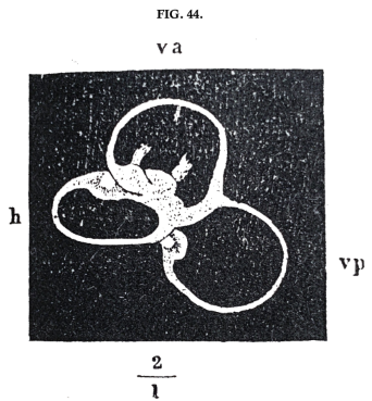 The form of the utriculus with its membranous semicircular canals is shewn in fig. 44. The ampullae project much more in the membranous than in the bony semicircular canals. According to the recent investigations of Rüdinger, the membranous semicircular canals do not float in the bony ones, but are fastened to the convex side of the latter. In each ampulla there is a pad-like prominence directed inwards, into which fibriles of the auditory nerve enter; and on the utriculus there is a place which is flatter and thickened. The peculiar manner in which the nerves terminate in this place will be described hereafter. Whether these, and the whole apparatus of the semicircular canals, assist in the sensation of hearing, has latterly been rendered very doubtful. [See p. 151.]