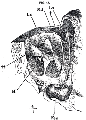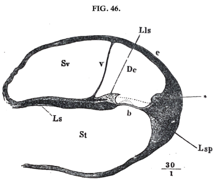 Finally, it must be observed that the membranous partition of the cochlea is not a single membrane, but a membranous canal (ductus cochleāris). Its inner margin is turned towards the central axis or mŏdĭŏlus, and attached to the rudimentary bony partition (lāmĭna spīrālis). A part of the opposite external surface is attached to the inner surface of the bony gallery. Fig. 45 shews the bony parts of a cochlea which has been laid open, and fig. 46 (p. 138), a transverse section of the canal (which is imperfect on the left hand at bottom). In both figures Ls denotes the bony part of the partition, and in fig. 46 v and b are the two unattached parts of the membranous canal. The transverse section of this canal is, as the figure shews, nearly triangular, so that an angle of the triangle near Lls is attached to the edge of the bony partition. The commencement of the ductus cochlearis at the base of the cochlea, communicates, as already stated, by means of a narrow membranous canal with the sacculus in the vestibule. Of the two unattached strips of its membranous walls, the one facing the vestibule gallery is a soft membrane, incapable of offering much resistance — Reissner's membrane (membrāna vestibulāris, v, fig. 46, p. 138); but the other, the membrāna băsĭlāris (b), is a firm, tightly stretched, elastic membrane, striped radially, corresponding to its radial fibres. It splits easily in the direction of these fibres, shewing that it is but loosely connected in a direction transverse to them. The terminations of the nerves of the cochlea and their appendages, are attached to the membrana băsĭlāris, as is shewn by the dotted lines in fig. 46.