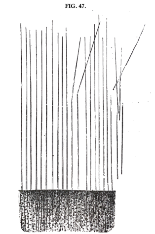The nerves of the vestibule terminate in the thickened places of the bags of the membranous labyrinth, already mentioned (p. 137), where the tissue has a greater and almost cartilaginous consistency. One of these places, provided with nerves, projects like a fillet into the inner part of the ampulla of each semicircular canal, and another lies on each of the little bags in the vestibule. The nerve fibres here enter between the soft cylindrical cells of the fine cuticle (ĕpĭthēlĭum) which covers the internal surface of the fillets. Projecting from the internal surface of this epithelium in the ampullae, Max Schultze discovered a number of very peculiar, stiff, elastic hairs, shewn in fig. 47. They are much longer than the vibratory hairs of the ciliated epithe'lium (their length is \(\tfrac{1}{25}\) of a Paris line [or .00355 English inch] in the ray fish), brittle, and running to a very fine point. It is clear that fine stiff hairs of this kind are extremely well adapted for moving sympathetically with the motion of the fluid, and hence for producing mechanical irritation in the nerve fibres which lie in the soft epithelium between their roots.