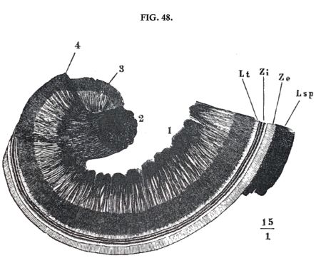 The expansion of the cochlean nerve is shewn in fig. 48. It enters through the axis (2) and sends out its fibres in a radial direction from the axis through the bony partition (1, 3, 4), as far as its margins. At this point the nerves pass under the commencement of the membrāna basilāris, penetrate this in a series of openings, and thus reach the ductus cochlearis and those nervous, elastic formations which lie on the inner zone (Zi) of the membrane.