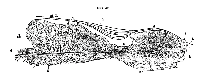 The margin of the bony partition (a to b, fig. 49, p. 140), and the inner zone of the membrana basilaris (a a') are shewn after Hensen. The under side of the figure[15] corresponds with the scala tympăni, the upper with the ductus cochlearis. Here h at the top and k at the bottom, are the two plates of the bony partition, between which the expansion of the nerve b proceeds. The upper side of the bony partition bears a fillet of close ligamentous tissue (Z, fig. 49, also shewn at Lis, fig. 46, p. 138), which, on account of the toothlike impressions on its upper side, is called the toothed layer (zo'na denticula'ta), and which carries a peculiar elastic pierced membrane, Corti's membrane, M.C. fig. 49. This membrane is stretched parallel to the membrana basilaris as far as the bony wall on the outer side of the duct, and is there attached a little above the other. Between these two membranes lie the parts in and on which the nerve fibres terminate.