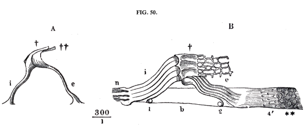 Among these Corti's arches (over g in fig. 49) are relatively the most solid formations. The series of these contiguous arches consists of two series of rods or fibres, an external and an internal. A single pair of these is shewn in fig. 50, A, below, and a short series of them in fig. 50, B, attached to the membrana basilaris, and at \(\dag\) also connected with the pierced tissue, into which fit the terminal cells of the nerves (fig. 49), which will be more fully described presently. These formations are shewn in fig. 51, (p. 141), as seen from the vestibule gallery; a is the denticulated layer, c the openings for the nerves on the internal margin of the membrana basilaris, its external margin being visible at u u; d is the inner series of Corti's rods, e the outer; over these, between e and x is seen the pierced membrane, against which lie the terminal cells of the nerves.