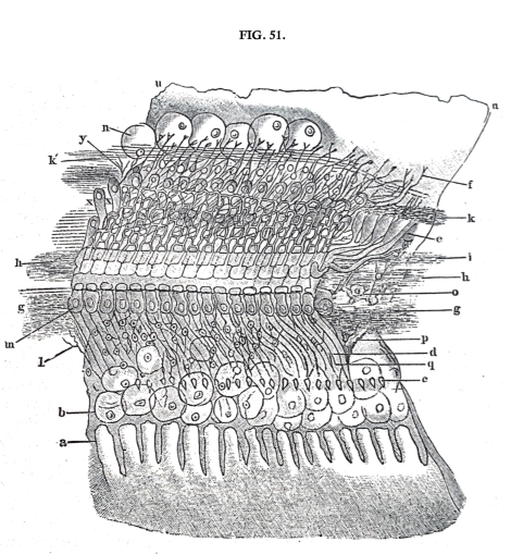 The connection of these parts is best shewn in fig. 49 opposite. They are grouped like a pad of soft cells on each side of and within Corti's arches. The most important of them appear to be the cells c and d, which are furnished with hairs, precisely resembling the ciliated cells in the ampullae and utriculus. They appear to be directly connected by fine varicose nerve fibres, and constitute the most constant part of the cochlean formations; for with birds and reptiles, where the structure of the cochlea is much simpler, and even Corti's arches are absent, these little ciliated cells are always to be found, and their hairs are so placed as to strike against Corti's membrane during the vibration of the membrana basilaris. The cells at a and a', fig. 49 (p. 140), which appear in an enlarged condition at b and n in fig. 51 (p. 141), seem to have the character of an epithelium. In fig. 51 there will also be observed bundles and nets of fibres, which may be partly merely supporting fibres of a ligamentous nature, and may partly, to judge by their appearance as strings of beads, possess the character of bundles of the finest fibriles of nerves. But these parts are all so frail and delicate that there is still much doubt as to their connection and office.